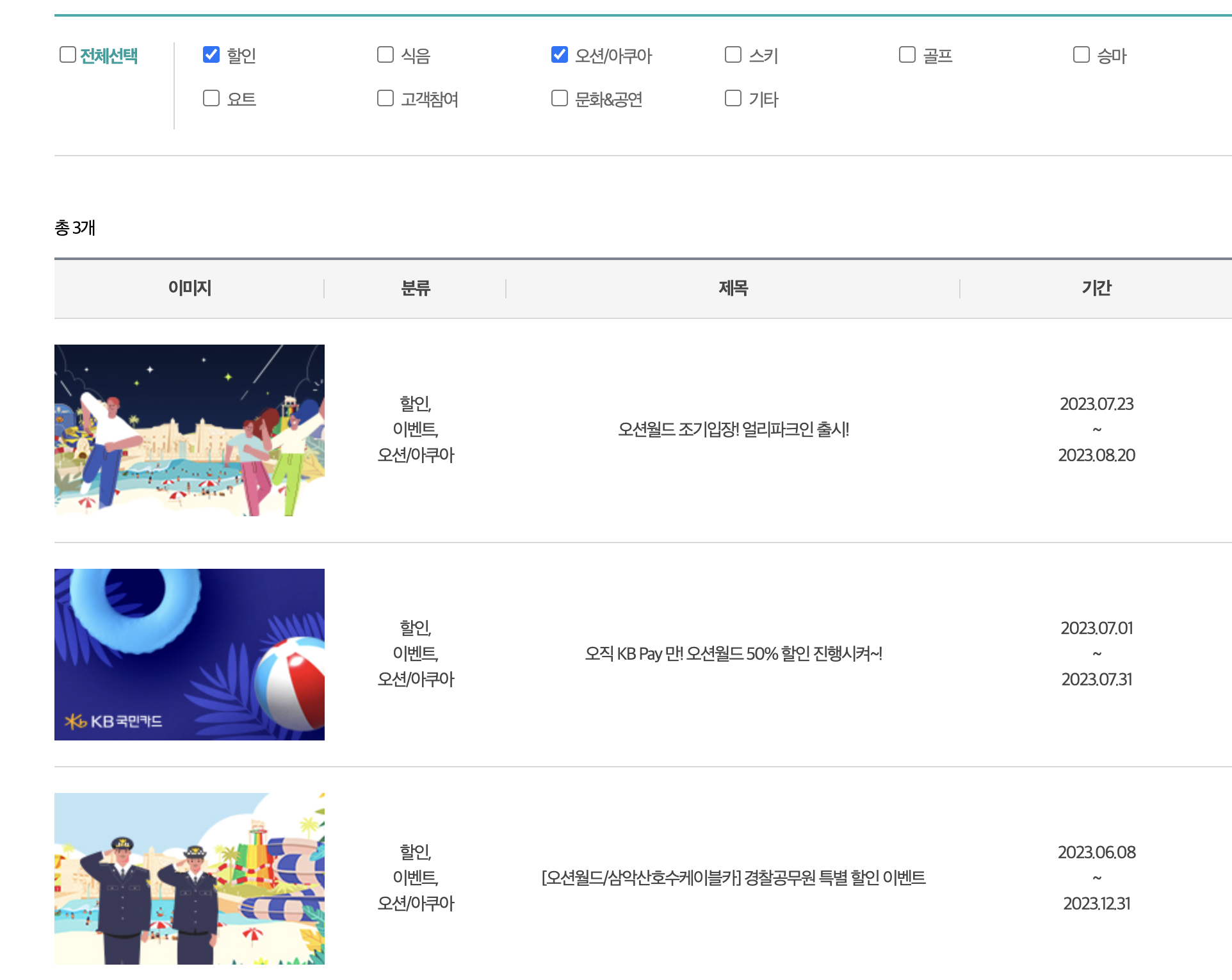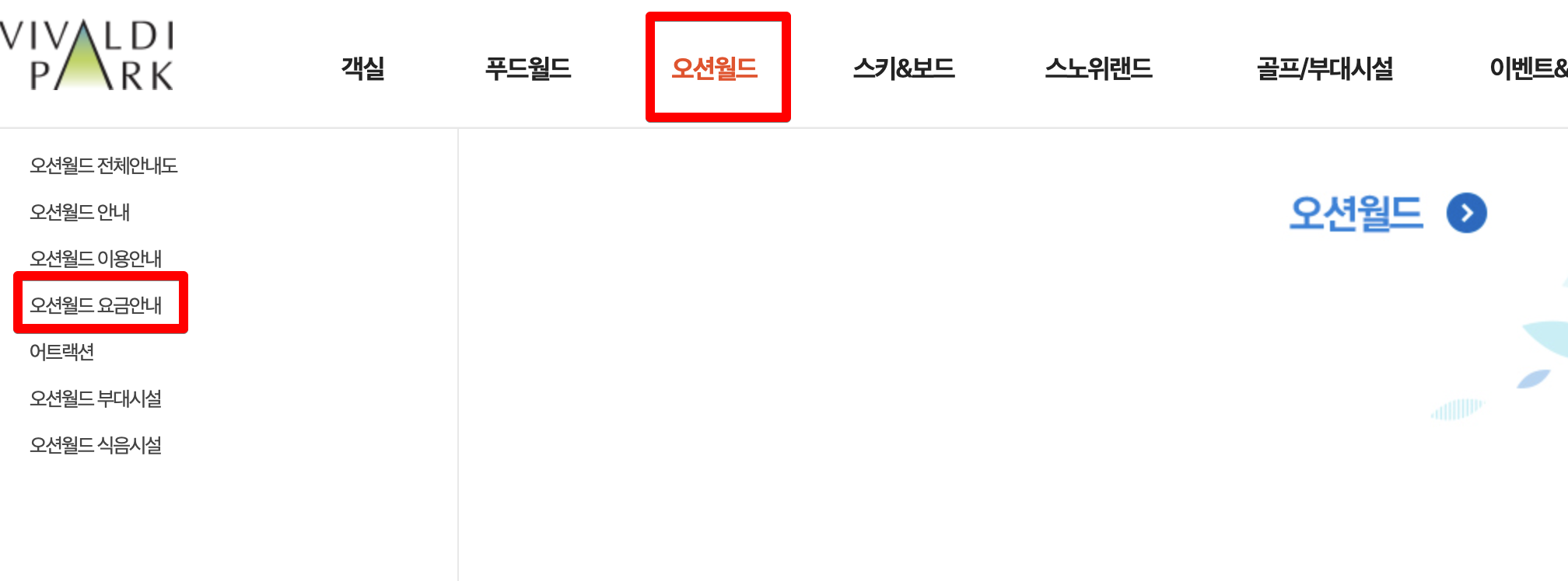 3. 오션월드 선택 후 오션월드 요금안내를 선택합니다.