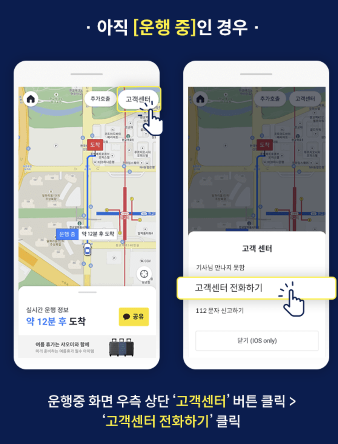운행 중 화면에서 우측 상단 '신고하기' 선택 > '고객센터 전화하기'로 연락하시면 됩니다.