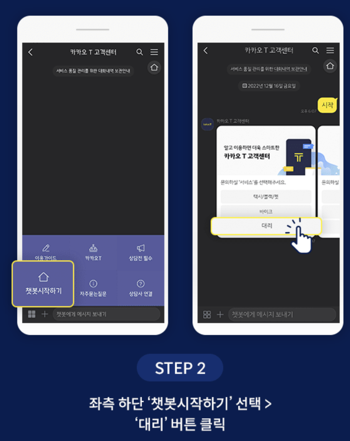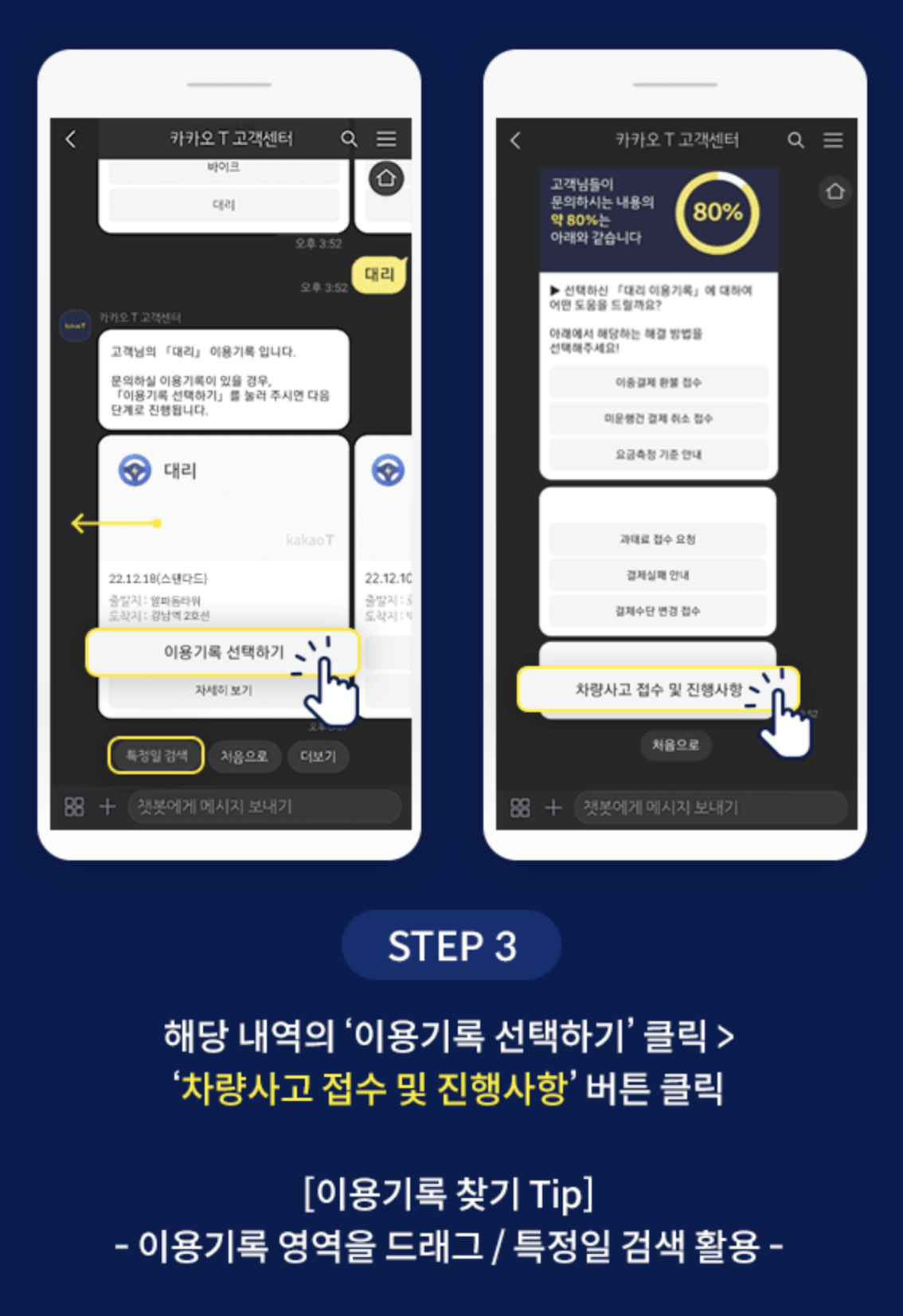 카카오 T앱 > 우측 하단 '내 정보' > '서비스 문의' > '챗봇 시작하기' > '대리' 선택 > '이용기록 선택하기' > '차량사고 접수' 선택