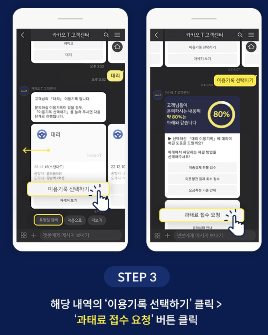 카카오 앱 > 우측하단 '내정보' > 서비스 문의 > 챗봇 시작하기 > '대리' 선택 > 이용기록 선택 > 과태료 접수 요청