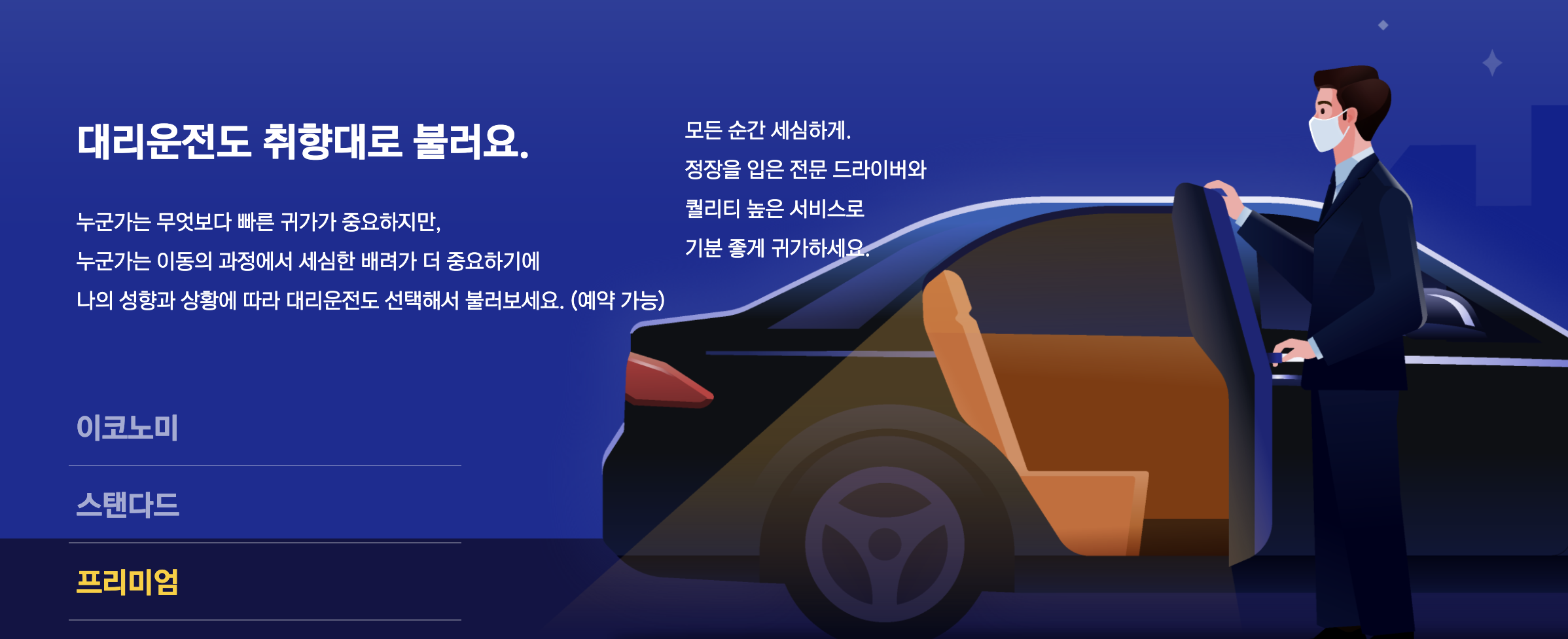 < 프리미엄 요금제 > 품격 있는 서비스를 원하시면 선택하세요. 정장 착용 전문 드라이버의 퀄리티 높은 서비스가 장점입니다.