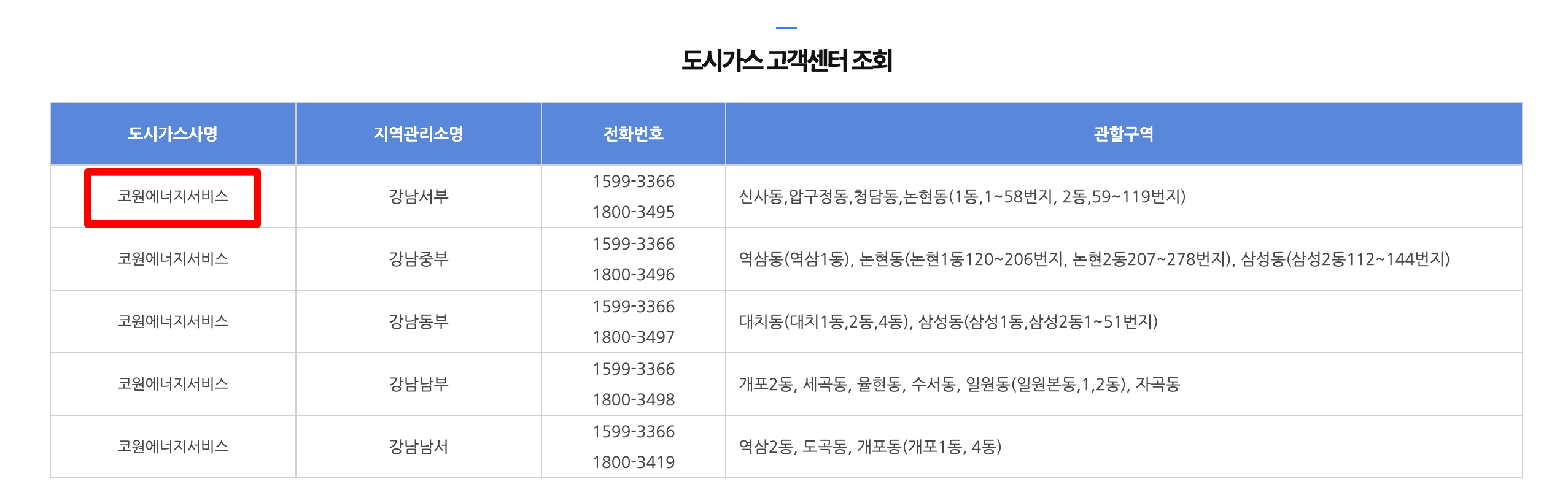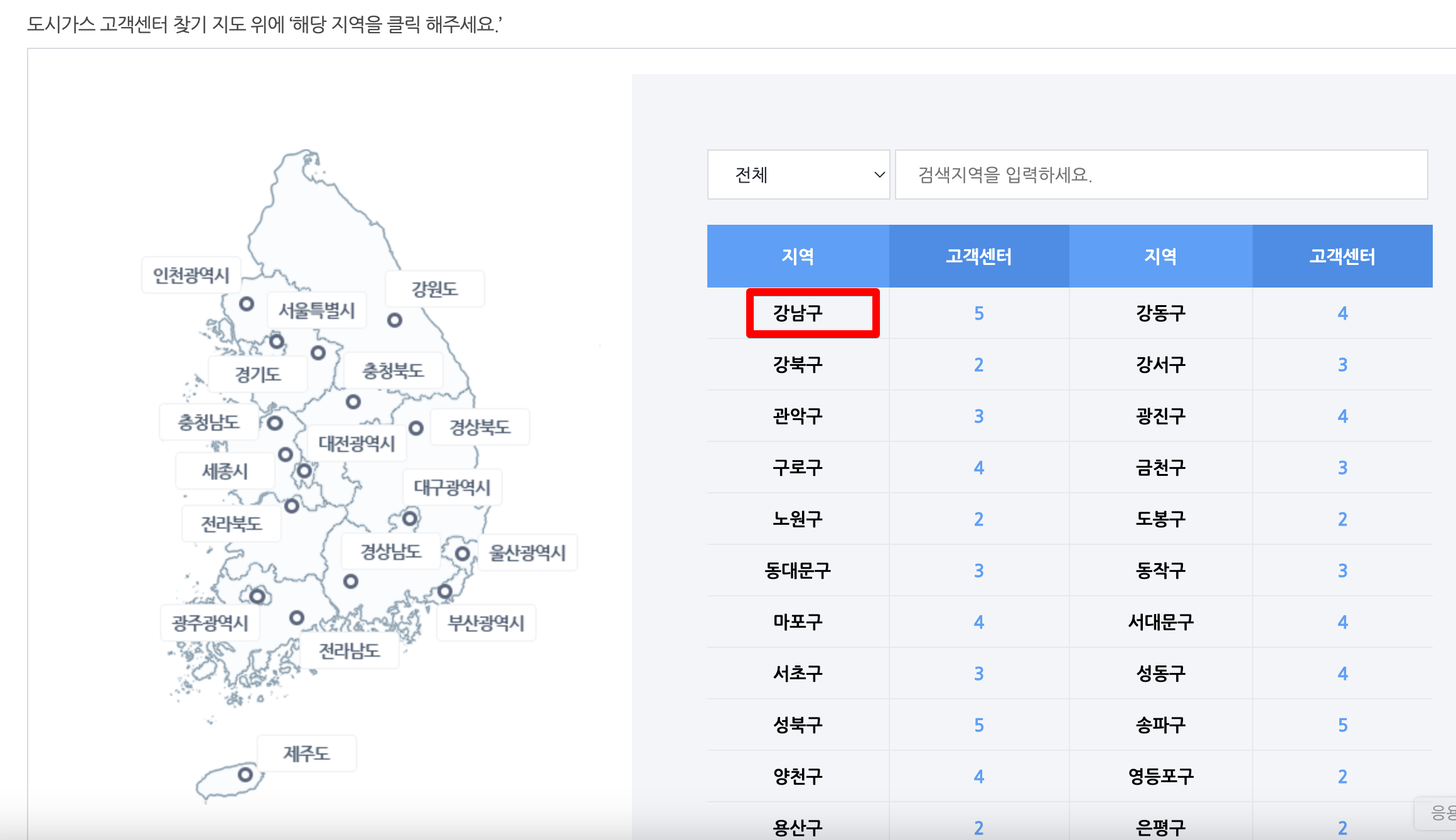 4. 강남구는 '코원에너지서비스'에서 도시가스를 공급하고 있습니다.