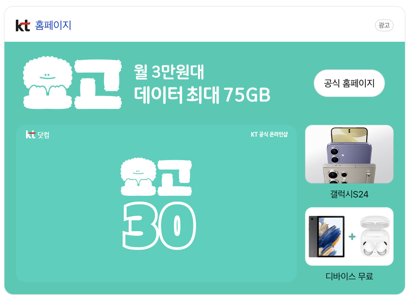 KT에서 3만 원대에 데이터 최대 75G를 이용하실 수 있는